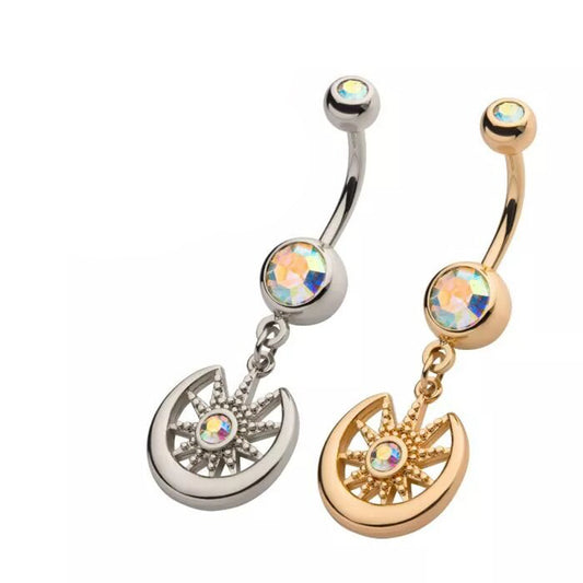 14g Aurora Borealis Moon & Sunburst Dangle Navel Ring