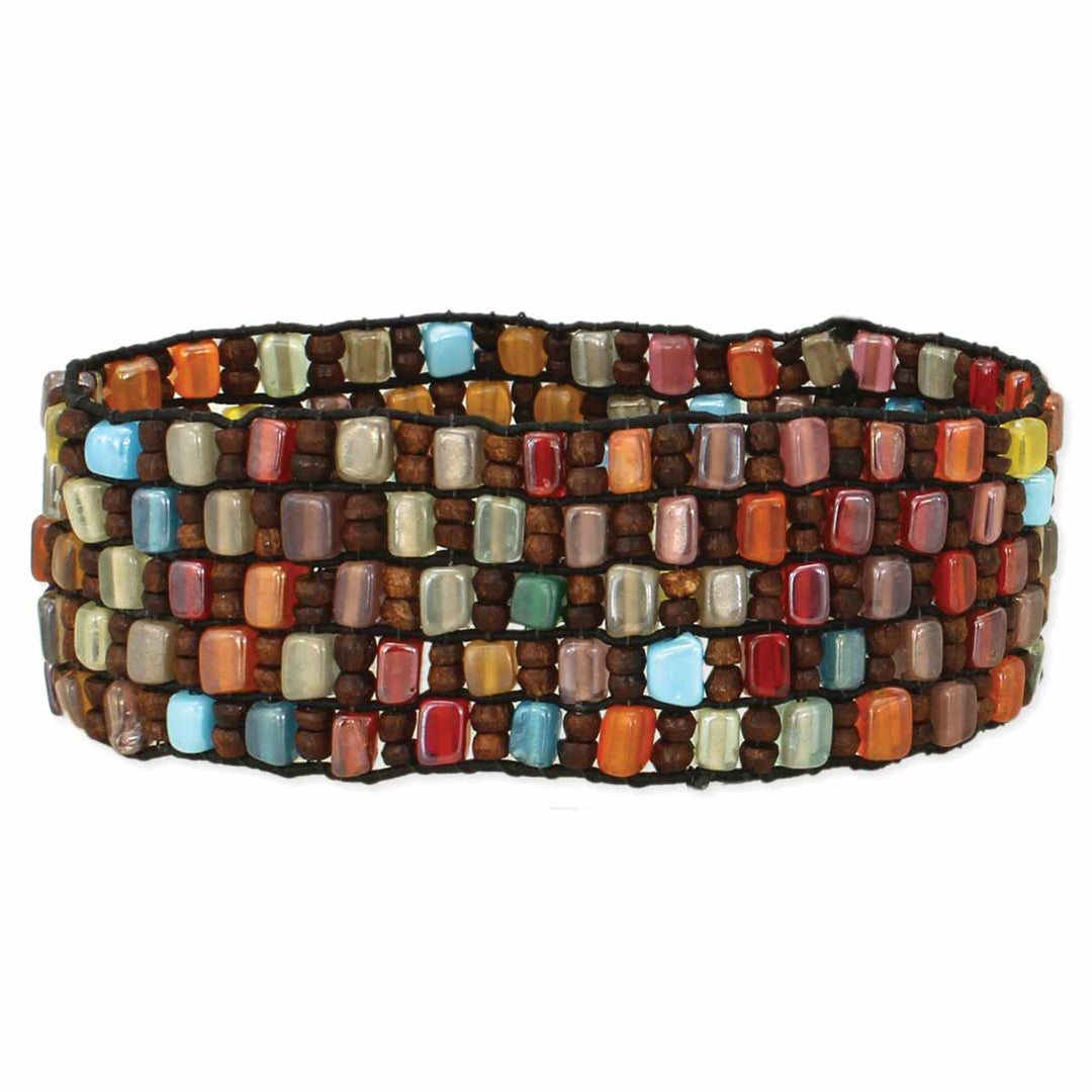 A multi color array of square glass beads is complimented with warm dark brown wooden beads to create a beautiful stretch bracelet. Artistic and elegant, this stretch bracelet is a must have.