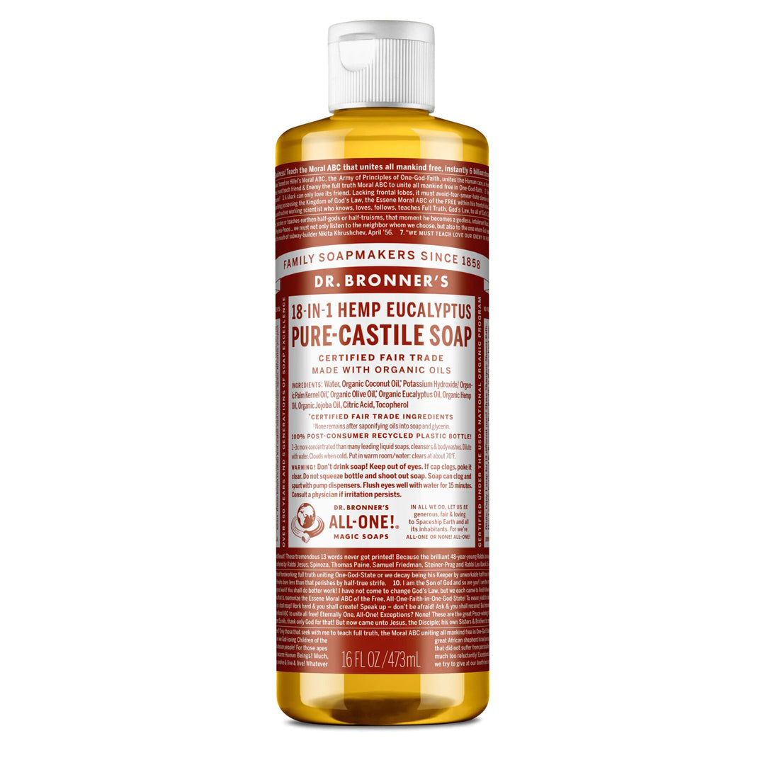 Earthy and warm, with a powerful menthol burst to clear congestion and focus the mind. Scented purely with organic eucalyptus oil, Dr. Bronner's Eucalyptus Pure-Castile Liquid Soap is concentrated, biodegradable, versatile and effective. Made with organic and certified fair trade ingredients. Organic hemp seed oil is now sourced in the U.S. following hemp legalization. Packaged in a 100% post-consumer recycled bottle.