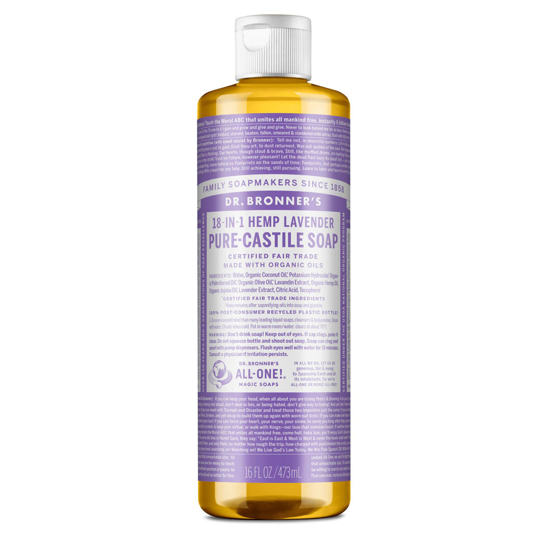 Scented with pure lavender and lavandin oils to calm the mind and soothe the body. Dr. Bronner's Pure-Castile Lavender Liquid Soap is concentrated, biodegradable, versatile and effective. Made with organic and certified fair trade ingredients. Organic hemp seed oil is now sourced in the U.S. following hemp legalization. Packaged in a 100% post-consumer recycled bottle.