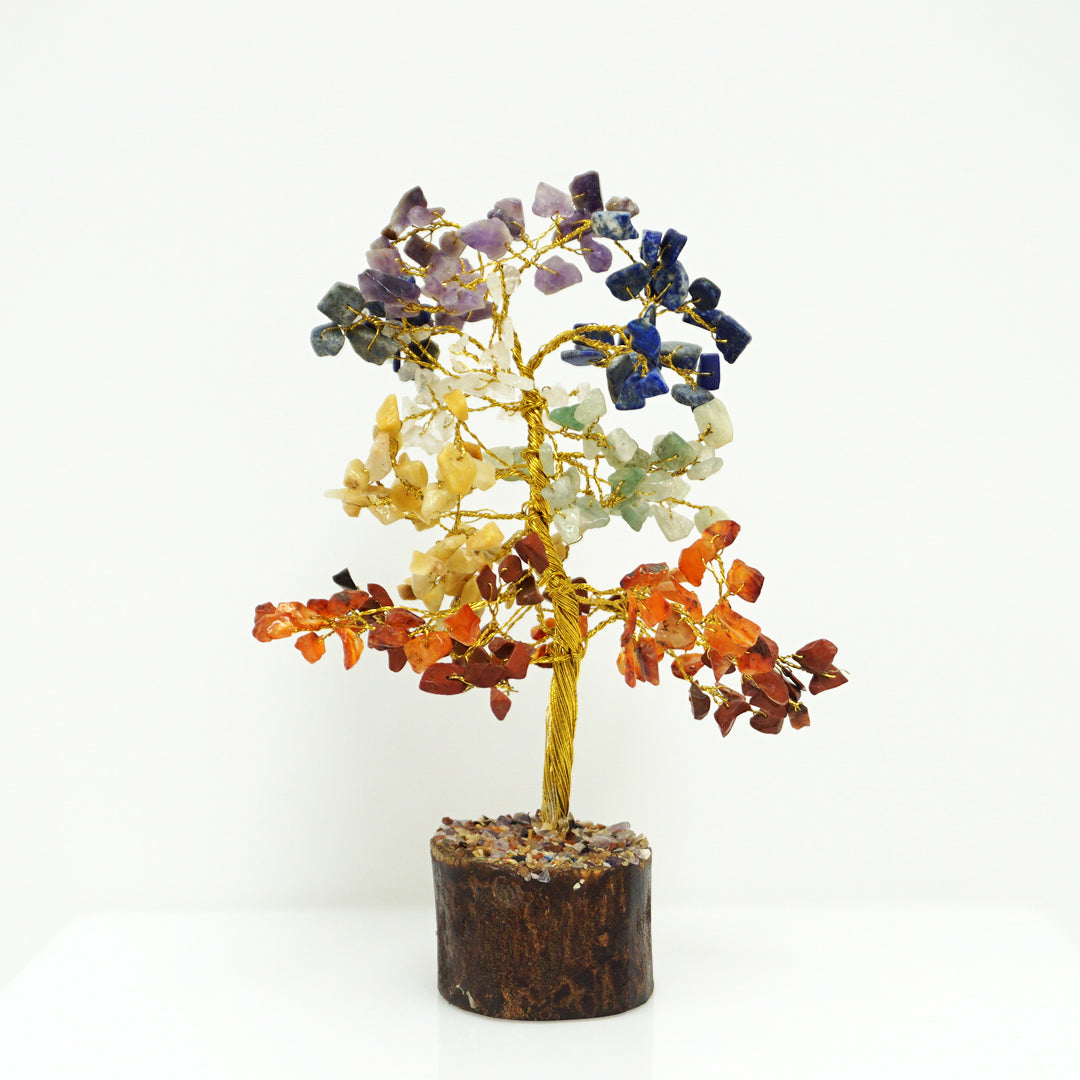 The Chakra Gem Tree has "leaves" made from gemstone chips representing the 7 Chakra colors. The chips are drilled and wrapped on non-tarnish gold wire and the tree is mounted in tiny gemstone pieces covering a round wood base.