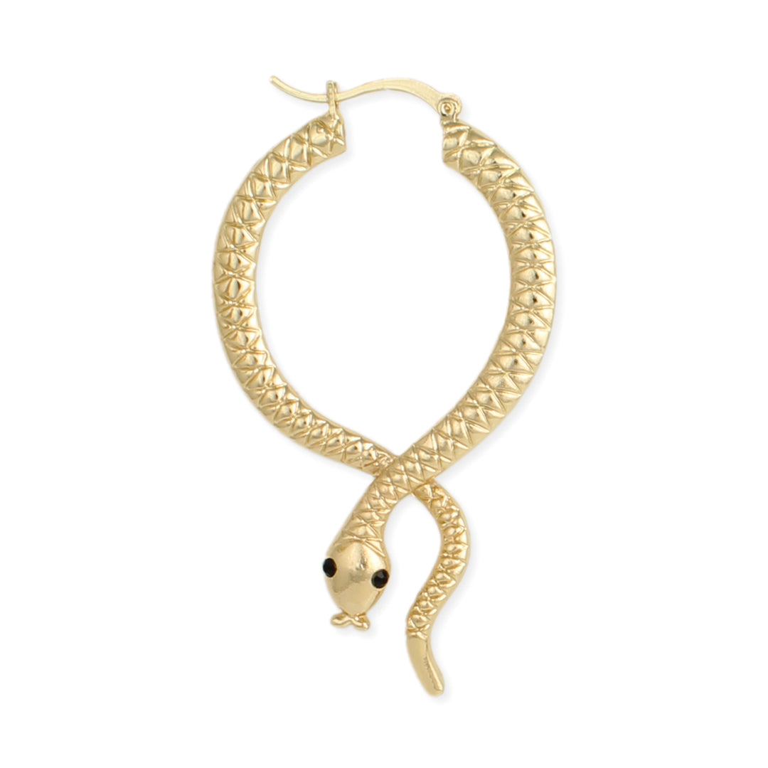 Only the best for the Queen of the Nile! Wear these decadent slithering snake hoop earrings and dream of exotic lands. This shiny gold metal hoop earring features a textured looping snake with black crystal eyes and a curvy tail.