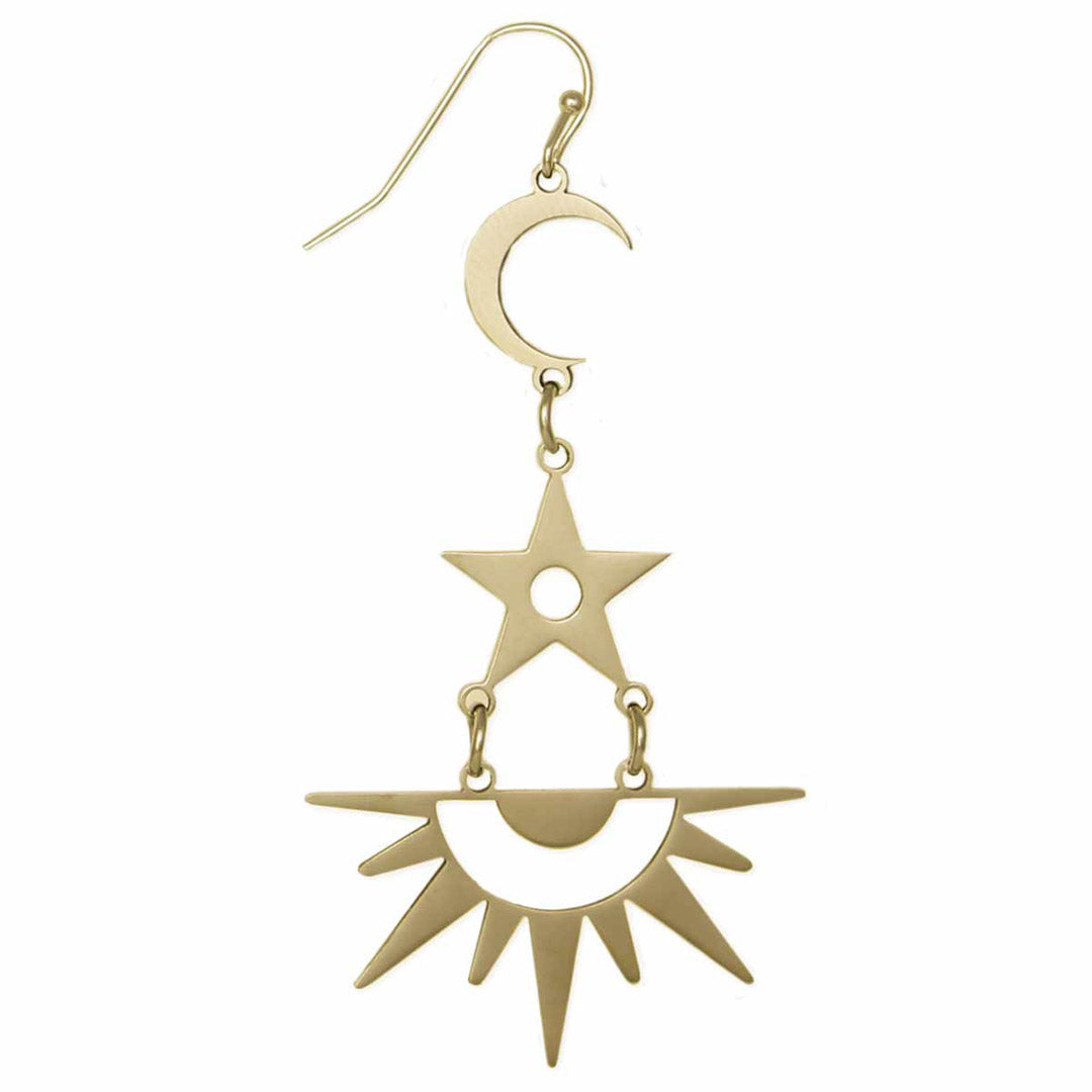 A heavenly pair of earrings. Gold, linear earrings that feature a crescent moon, star and radiant sun.