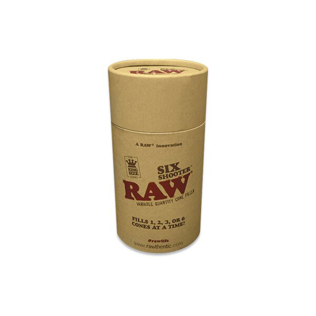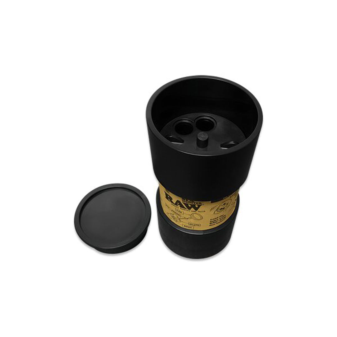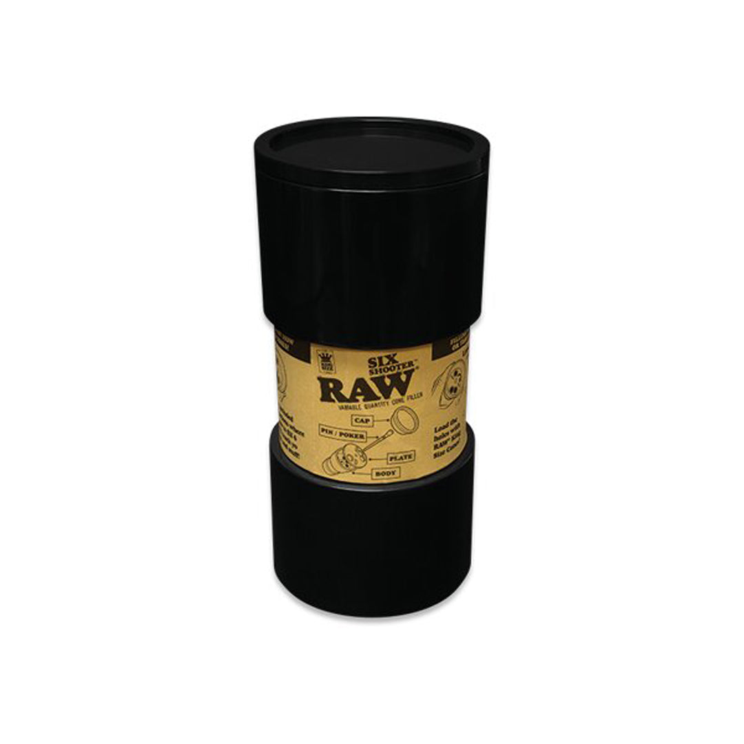 Fill 1, 2, 3 or 6 cones at a time with the Raw Six Shooter. Inspired by an old Spanish millstone, just loosen the center pin and dial the plate to the quantity you want to fill. Place the cones in the open holes, add your materials, fasten the top and start tapping. When you're done, remove the top and press your base plate down on the table. The cones will pop up like a toaster when you push down.